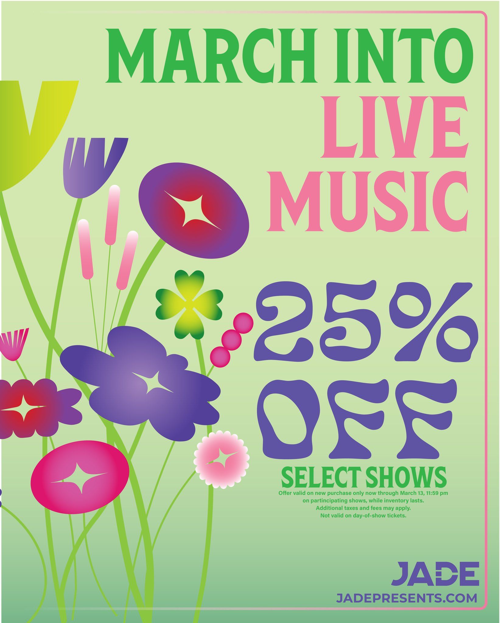 Jade Presents is offering the March Into Live Music, a limited-time ticket promotion offering savings on select upcoming concerts. Use promo code MARCH2026 at checkout to receive 25% off participating events for a limited time. This offer is only good until Friday, March 13 at 11:59PM.