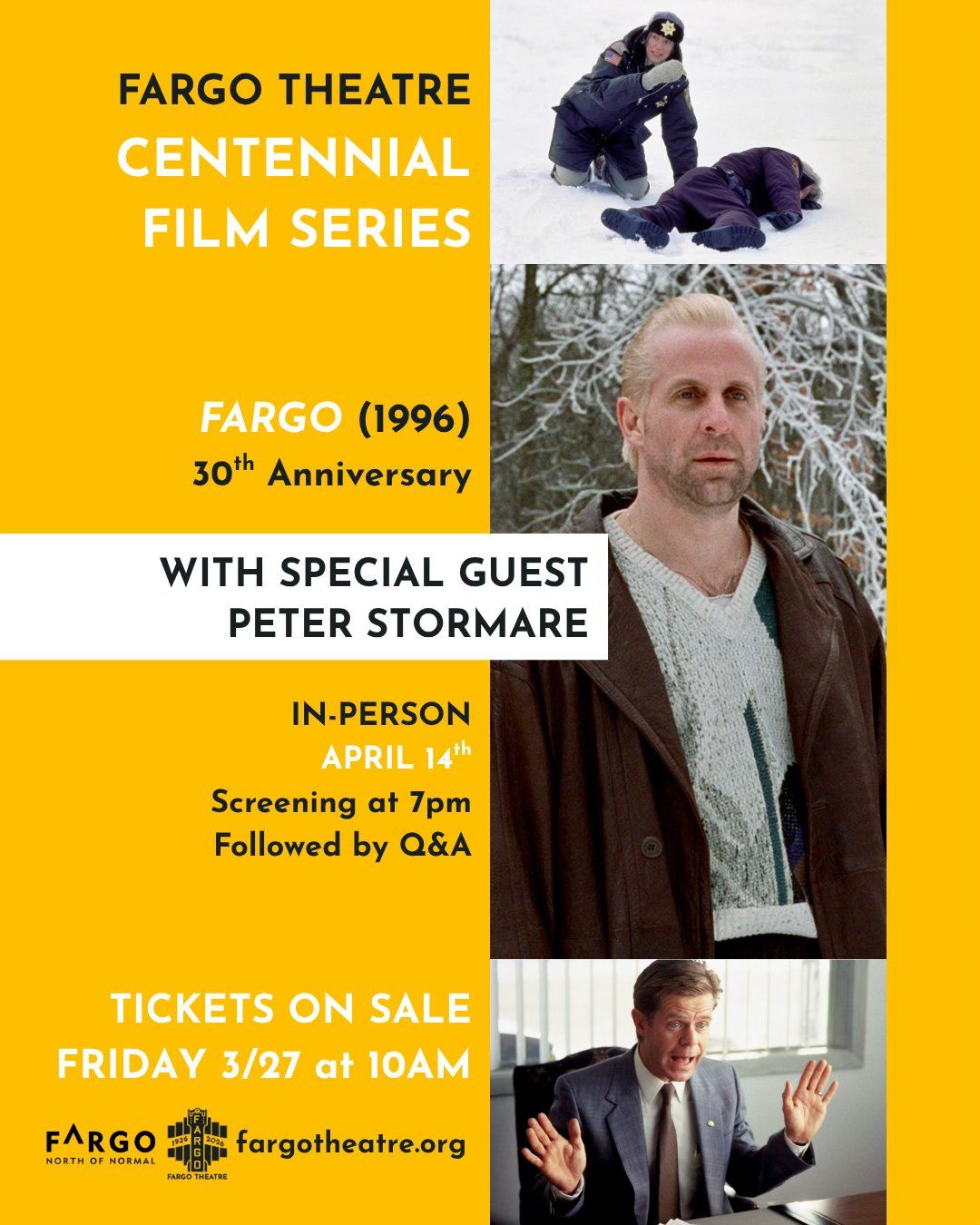 Tickets on sale 3/27 for the 4/14 special screening of the movie Fargo at the Fargo Theatre, with special guest Peter Stormare.